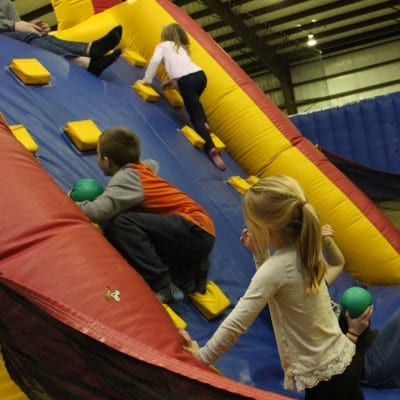 New age, new adventure! Choose from our indoor climbing wall, outdoor climbing tower, or outdoor giant swing to test your mettle. All climbers will be harnessed and wear helmets; challenge party events are overseen by our professionally trained ropes staff. Climbers must wear closed-toed shoes such as sneakers or Crocs.